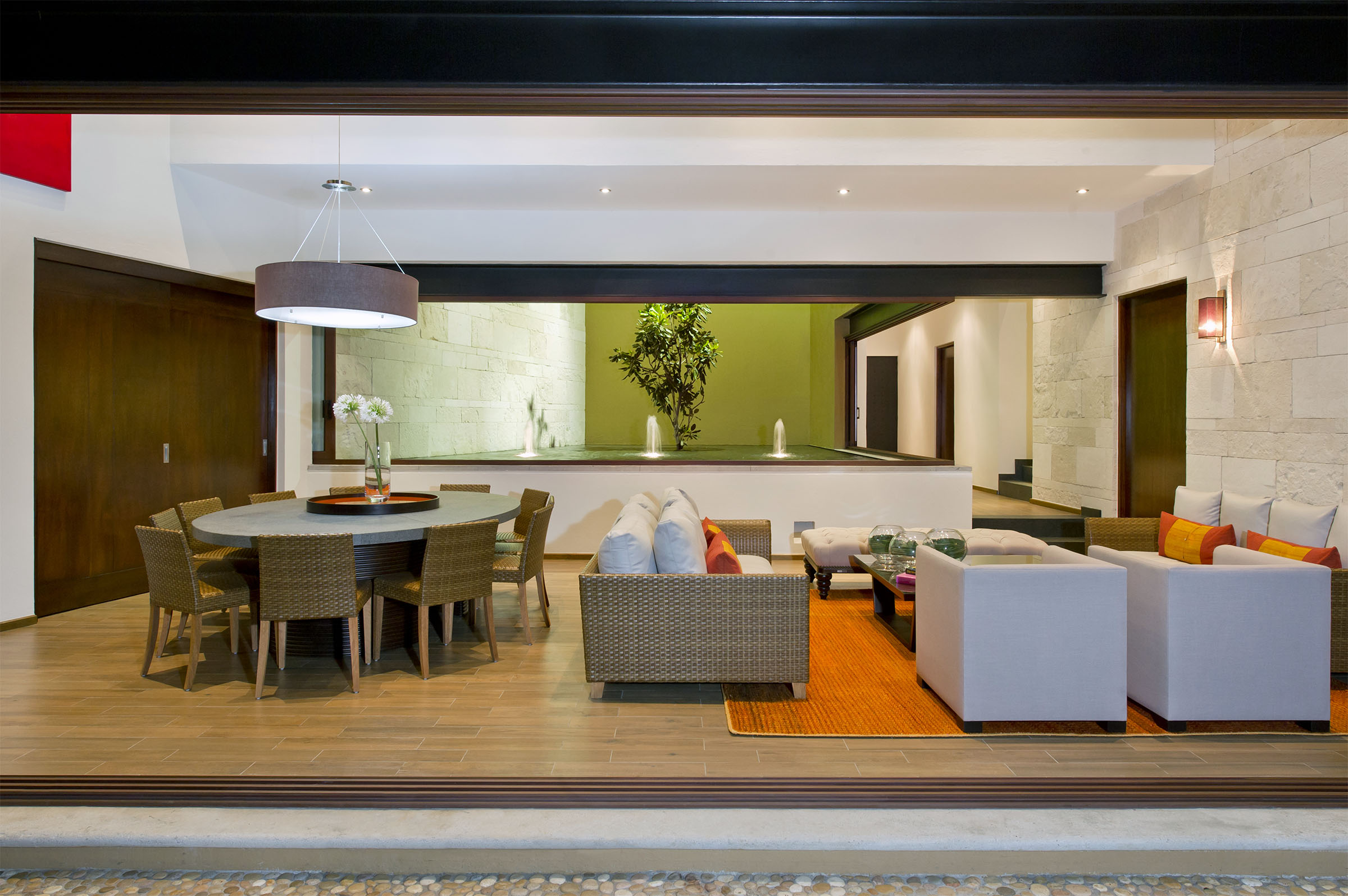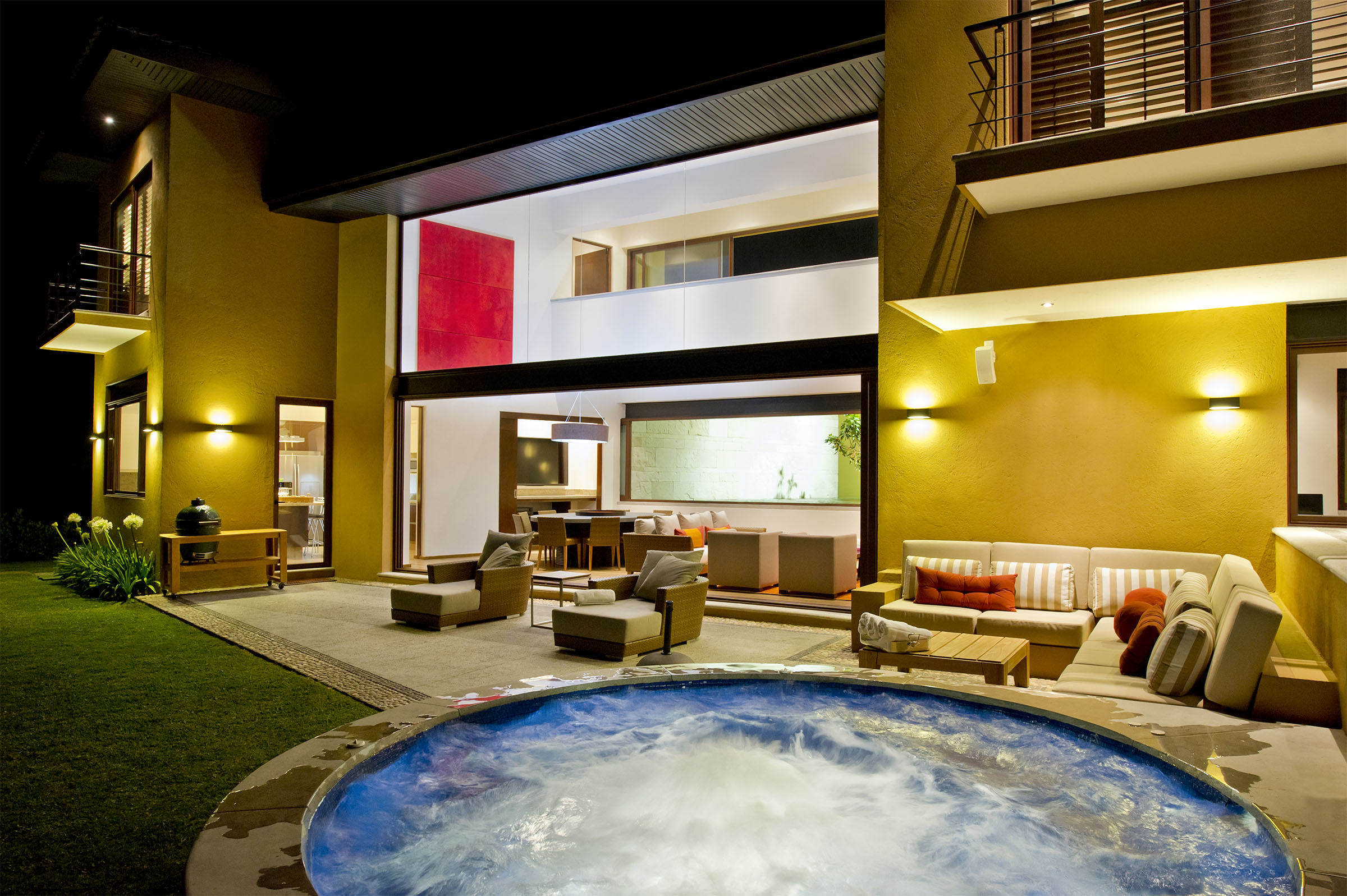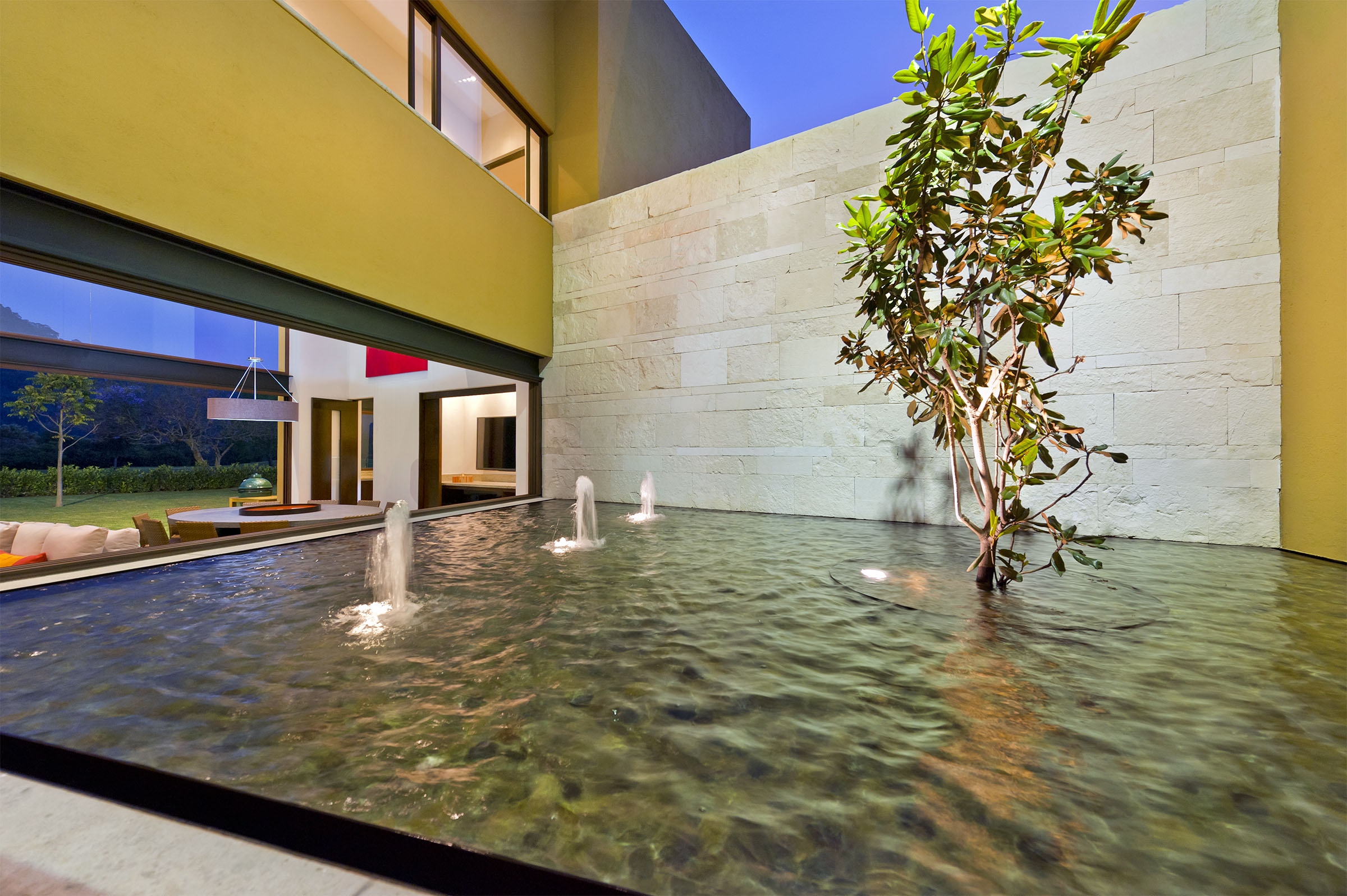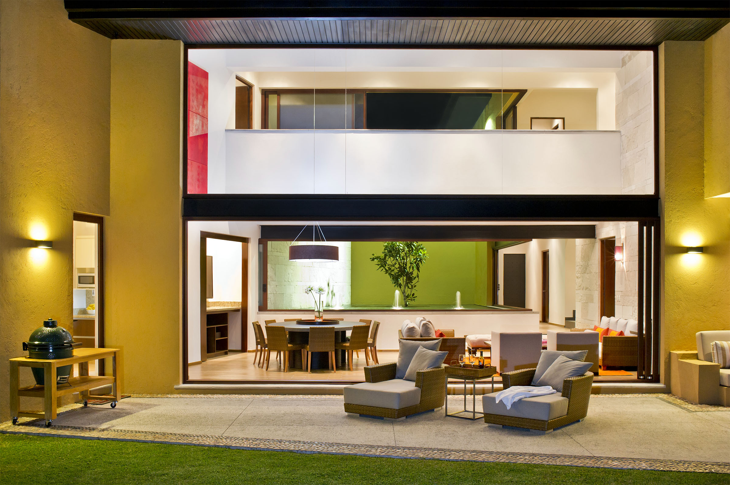 Lleno de color y con una maravillosa iluminación, el proyecto cobra vida de noche. Todas las líneas destacan, especialmente aquellas que emanan de la fuente interior central, que además de guiarte por distintos sitios de la casa, te hace sentir que habitas una gran terraza. Proyecto para Arq. Javier Duarte y @elenatalaverastudio (2016).