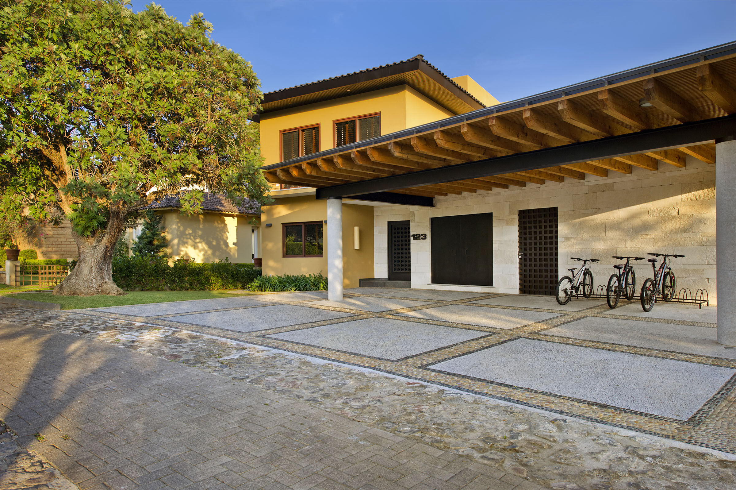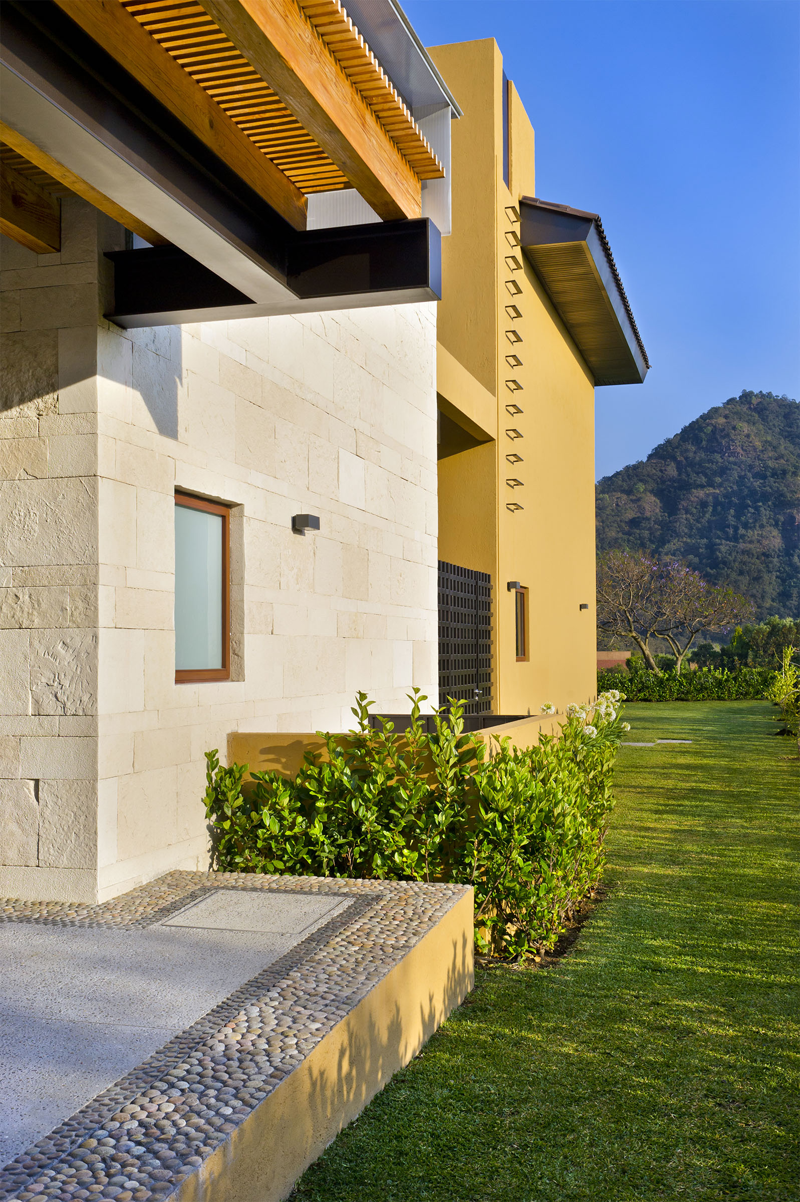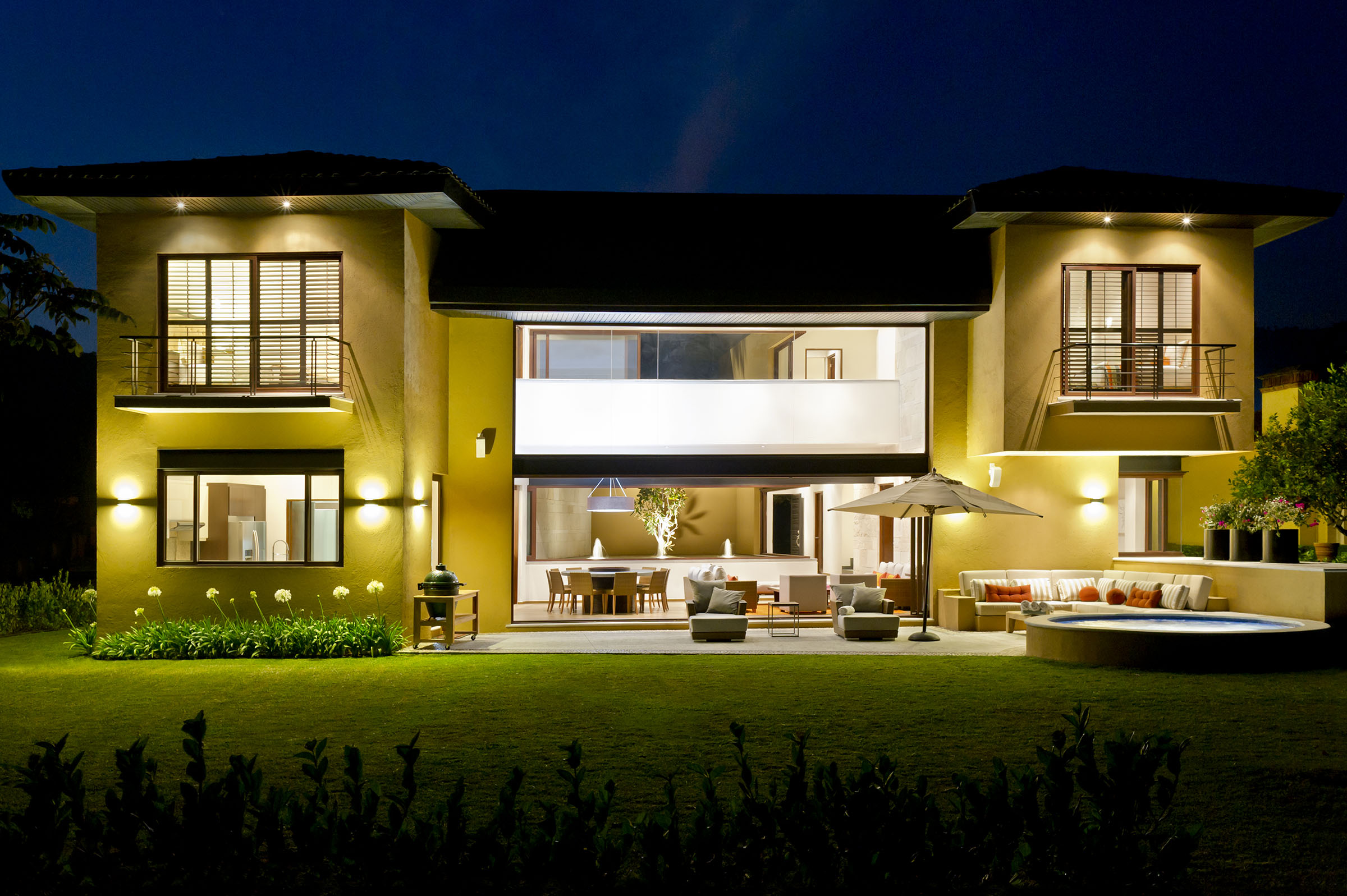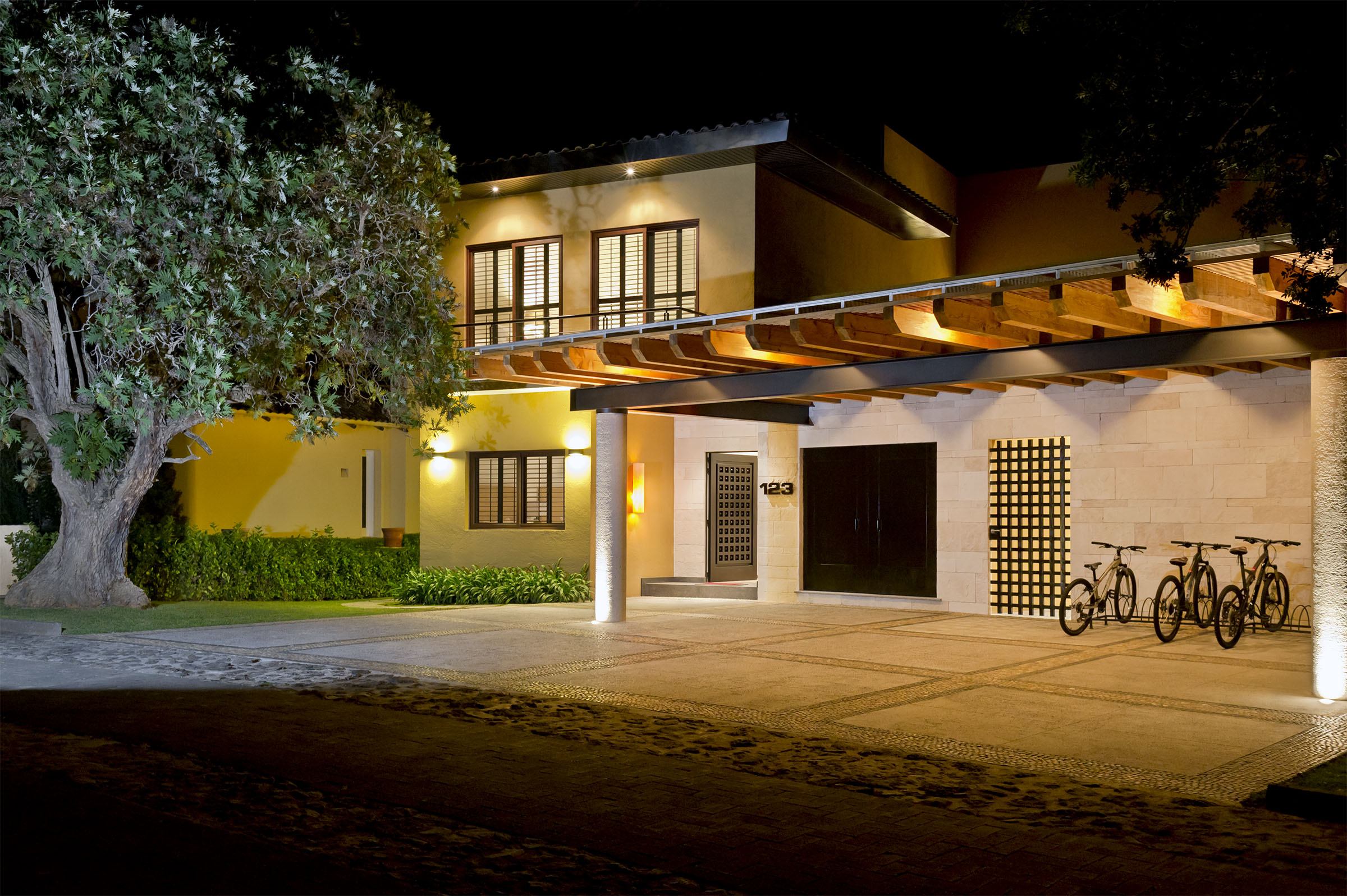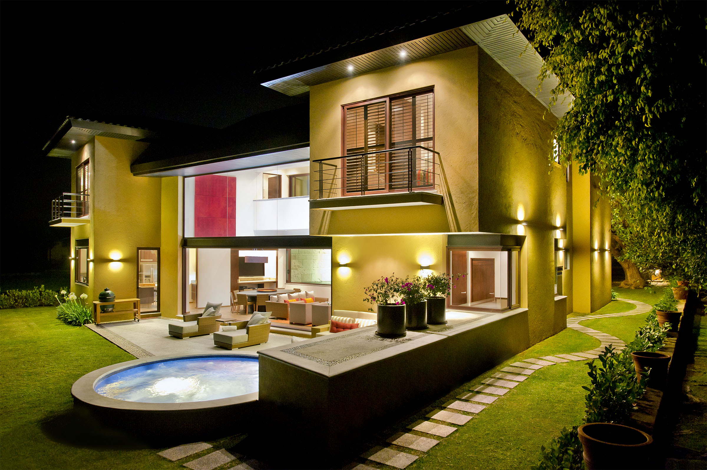 Lleno de color y con una maravillosa iluminación, el proyecto cobra vida de noche. Todas las líneas destacan, especialmente aquellas que emanan de la fuente interior central, que además de guiarte por distintos sitios de la casa, te hace sentir que habitas una gran terraza. Proyecto para Arq. Javier Duarte y @elenatalaverastudio (2016).